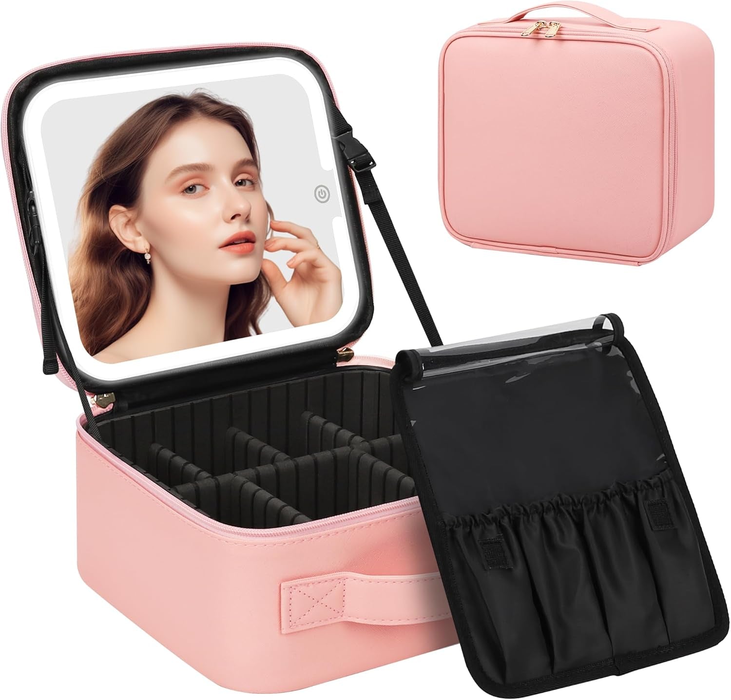 LED Makeup Bag with Illuminated Mirror, Travel Cosmetic Organizer for Women and Makeup Artists, Spacious Design with Adjustable Dividers and Brush Holder in Three Light Settings