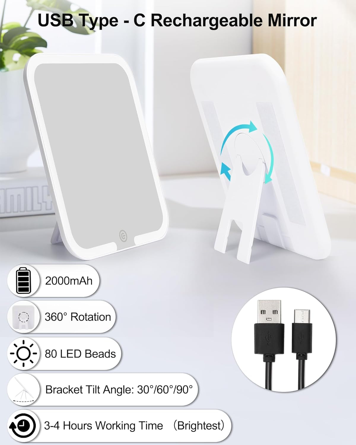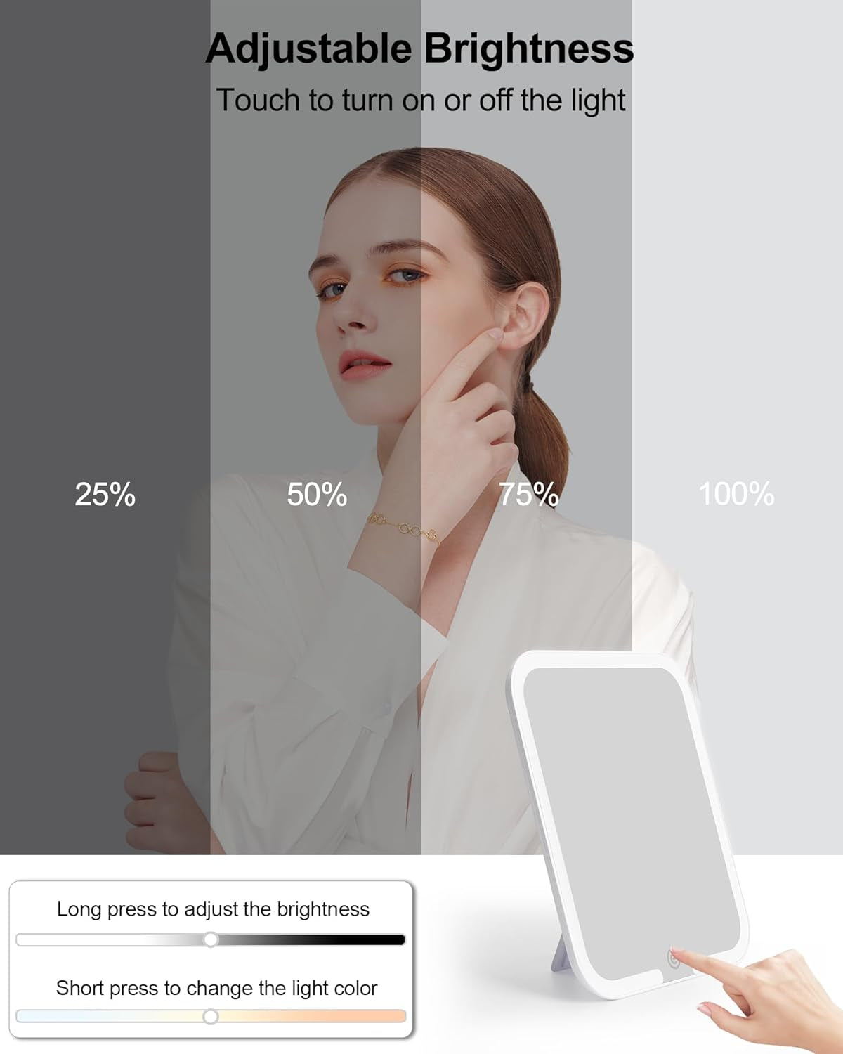 USB rechargeable LED mirror with three light settings and adjustable brightness to suit various makeup applications.