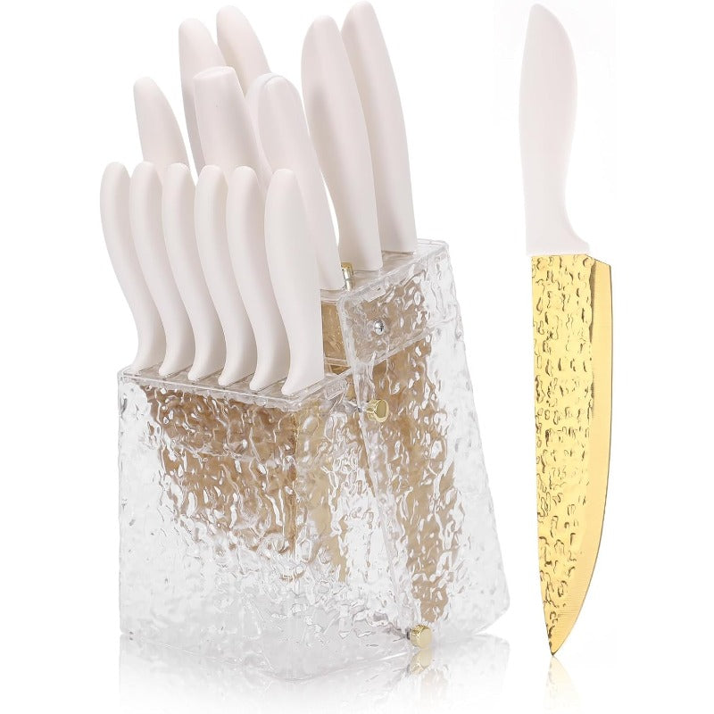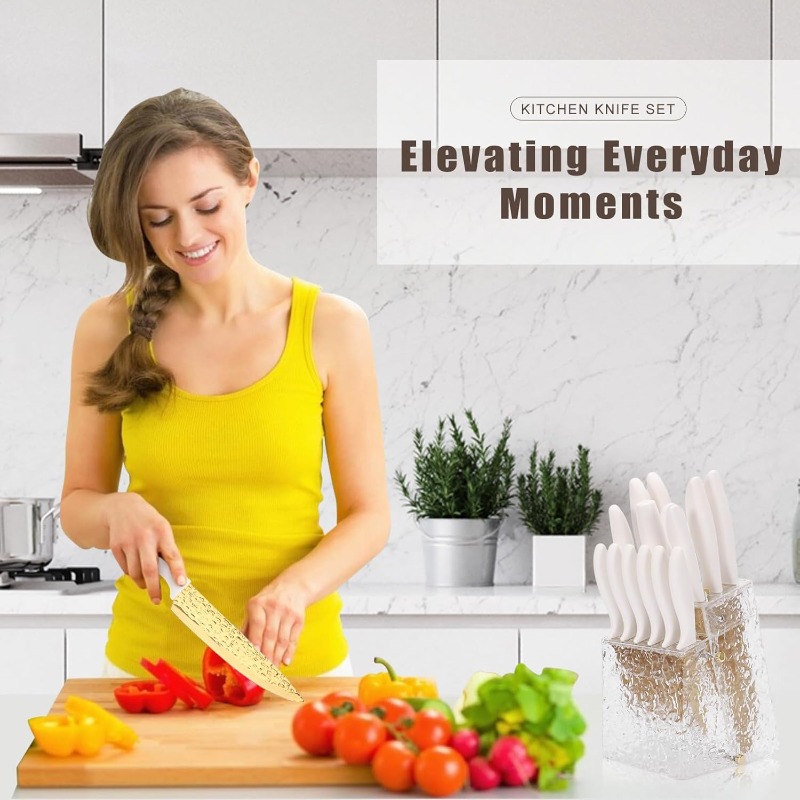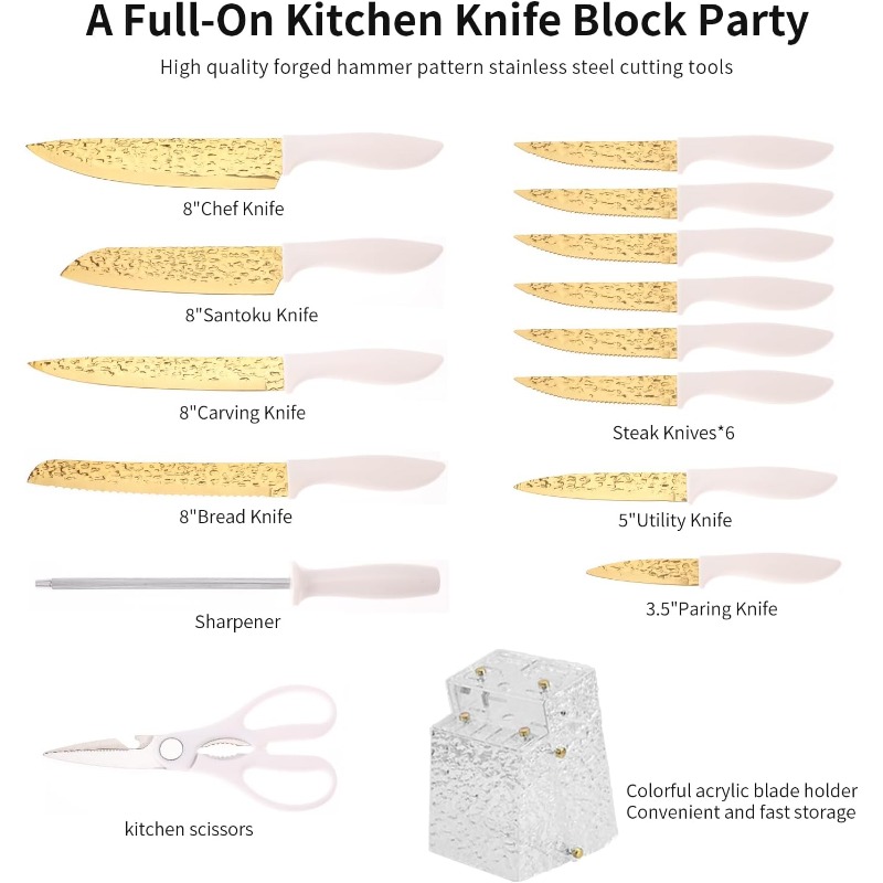 A knife collection tailored for your slicing requirements - This set of 15 knives features 1x 8" Santoku Knife, 1x 8" Chef Knife, 1x 8" Carving Knife, 1x 8" Bread Knife, 1x 3.5" Paring Knife, 1x 5" Utility Knife, 1x Sharpener, 1x Kitchen Shears, 6x Steak Knives, and 1x Knife Block. Everything you need for cooking in one package. Premium Quality Material for Cutting Items - This stainless steel knife is crafted from stainless steel, free from heavy metals and harmful chemicals. It will not chemically interact with food.
