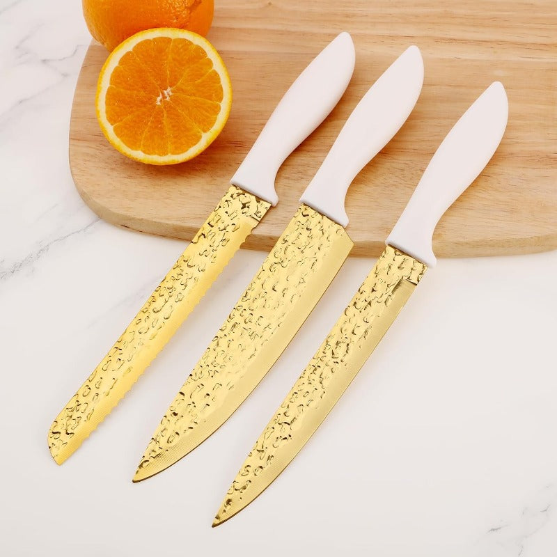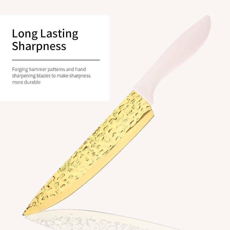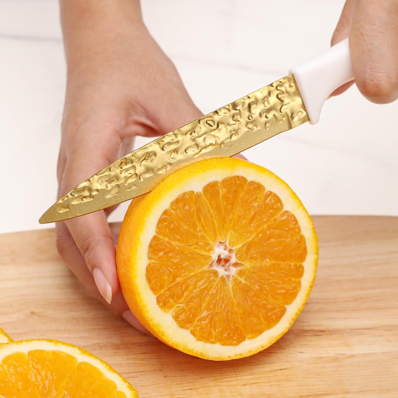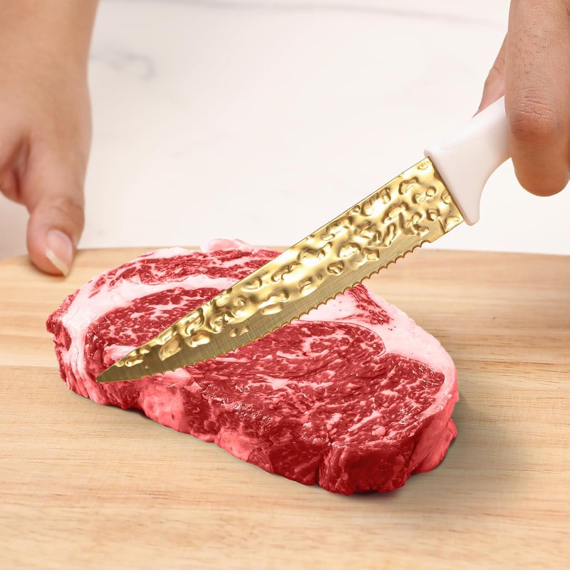 This knife does not leave any residue or produce an odor during use, helping to keep food's original taste and freshness for an extended period. The unique forged and hammered texture of the blade ensures it is non-stick and simple to care for. Our durable stainless steel knives are not only sharp but also lightweight, comfortable to hold, and easy to grip. You can effortlessly slice through various items like meat, bread, fruits, and vegetables, enhancing your cooking experience.
