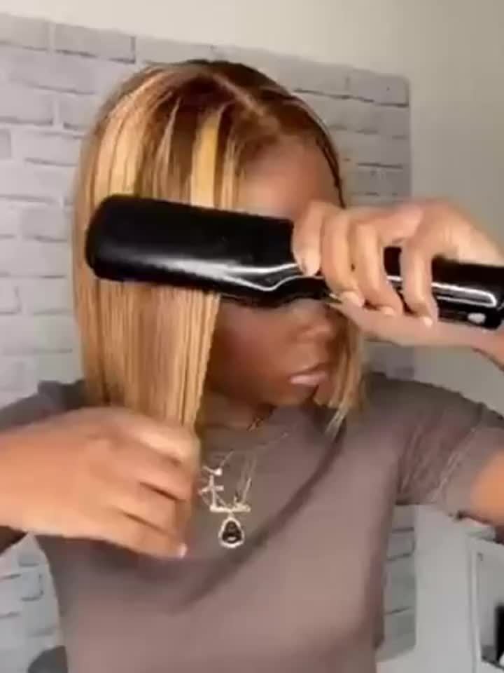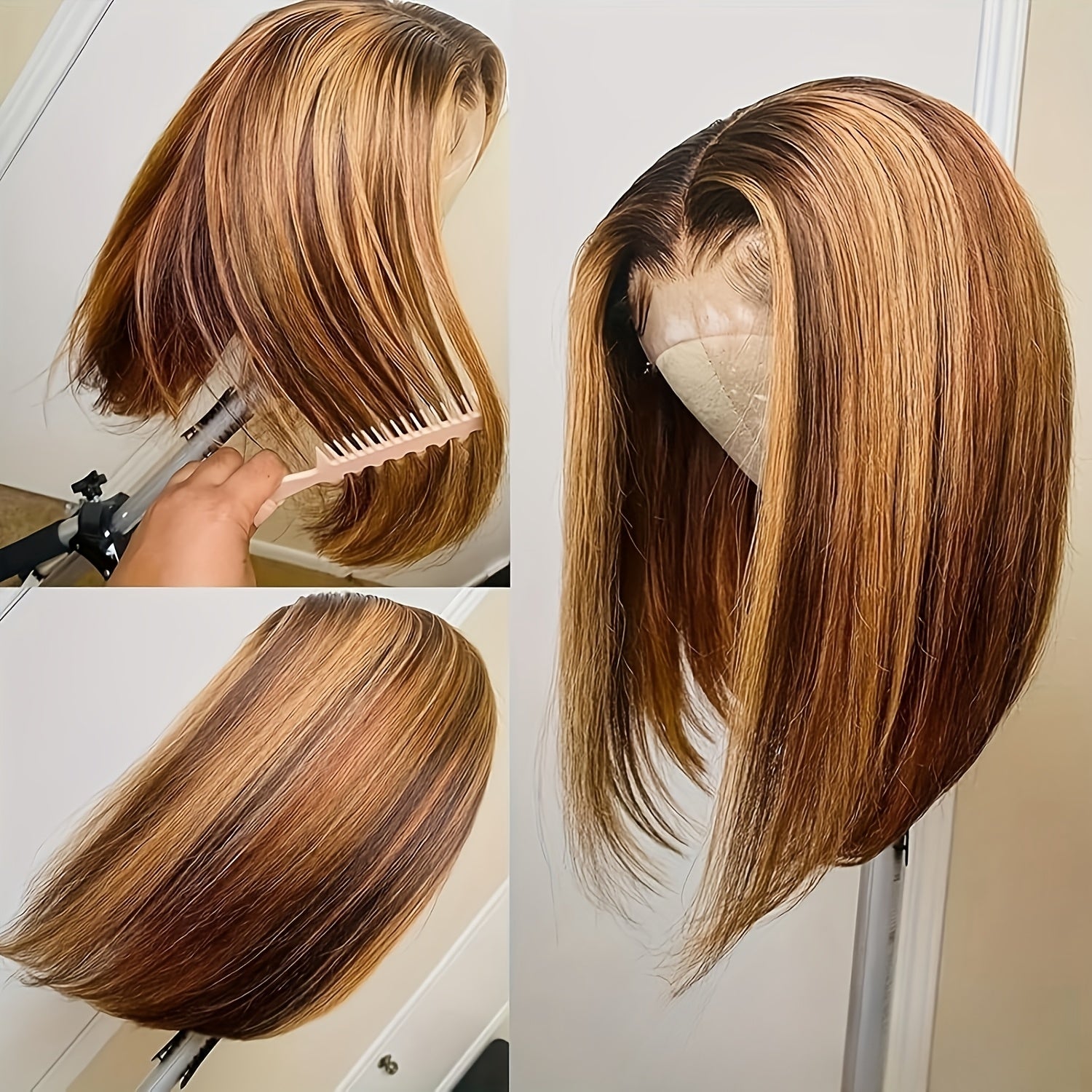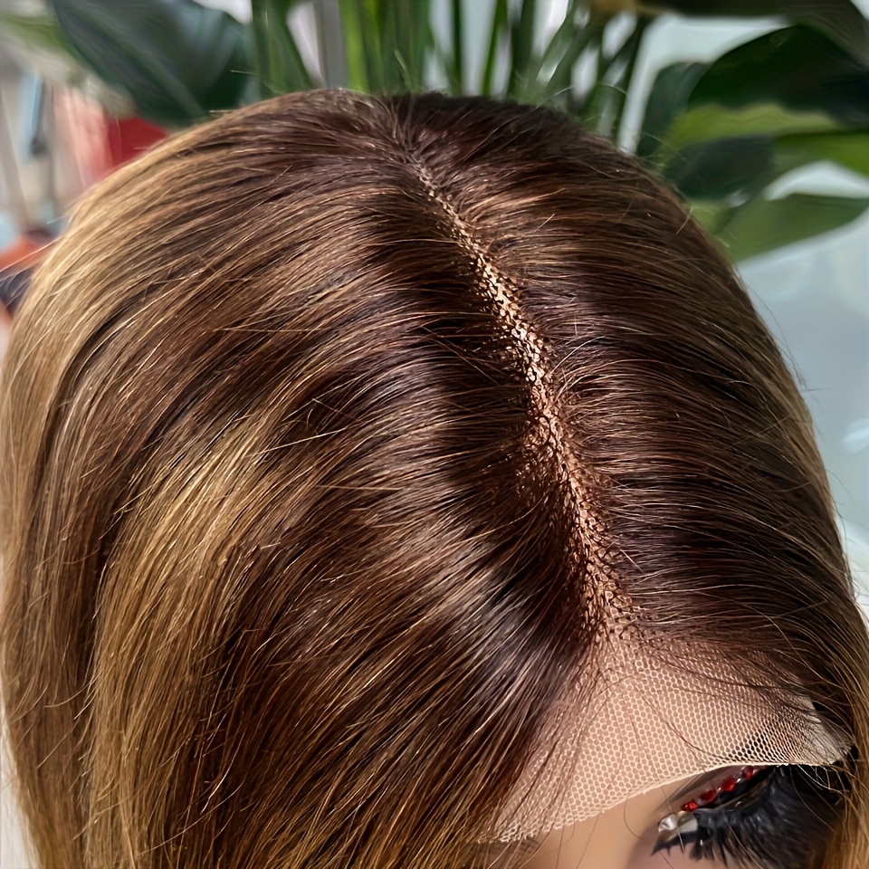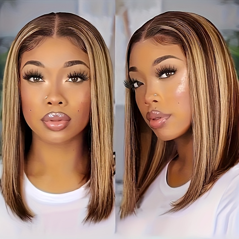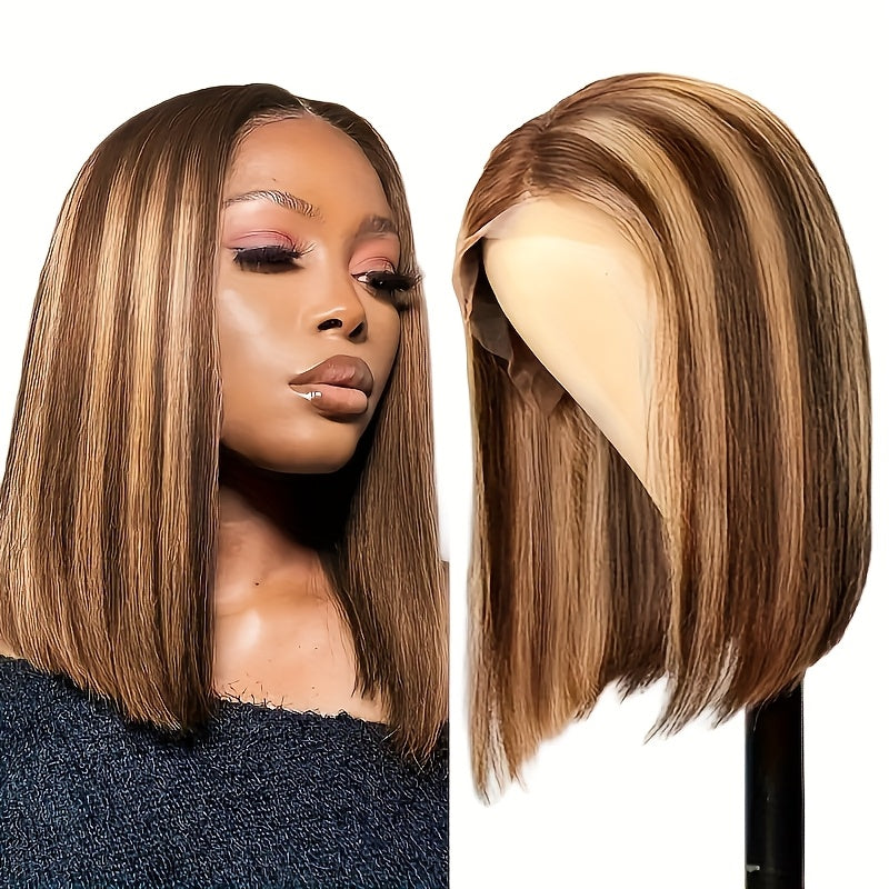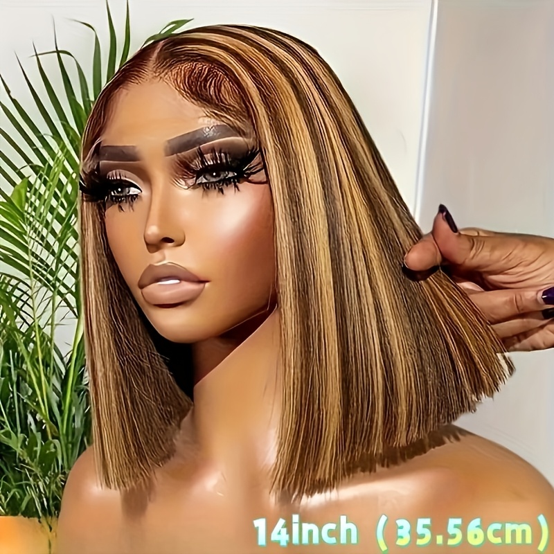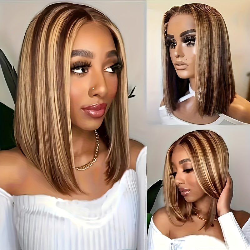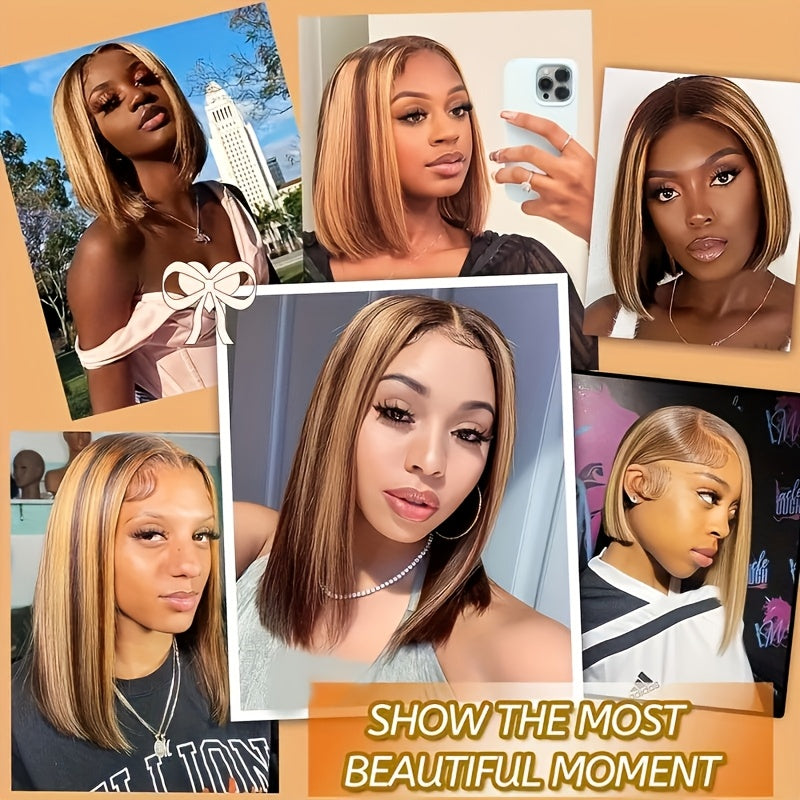 Special New Year Clearance: Highlighted Bob Wig made from Human Hair, featuring a Straight HD Lace design. This short bob wig has a 200% density in Honey Blonde and includes a 4x4x1 Honey Blonde Lace Closure. Ideal for women, it offers an Ombre 4/27 straight lace front style, pre-plucked with a T part, perfect for girls seeking colored Brazilian human hair wigs.