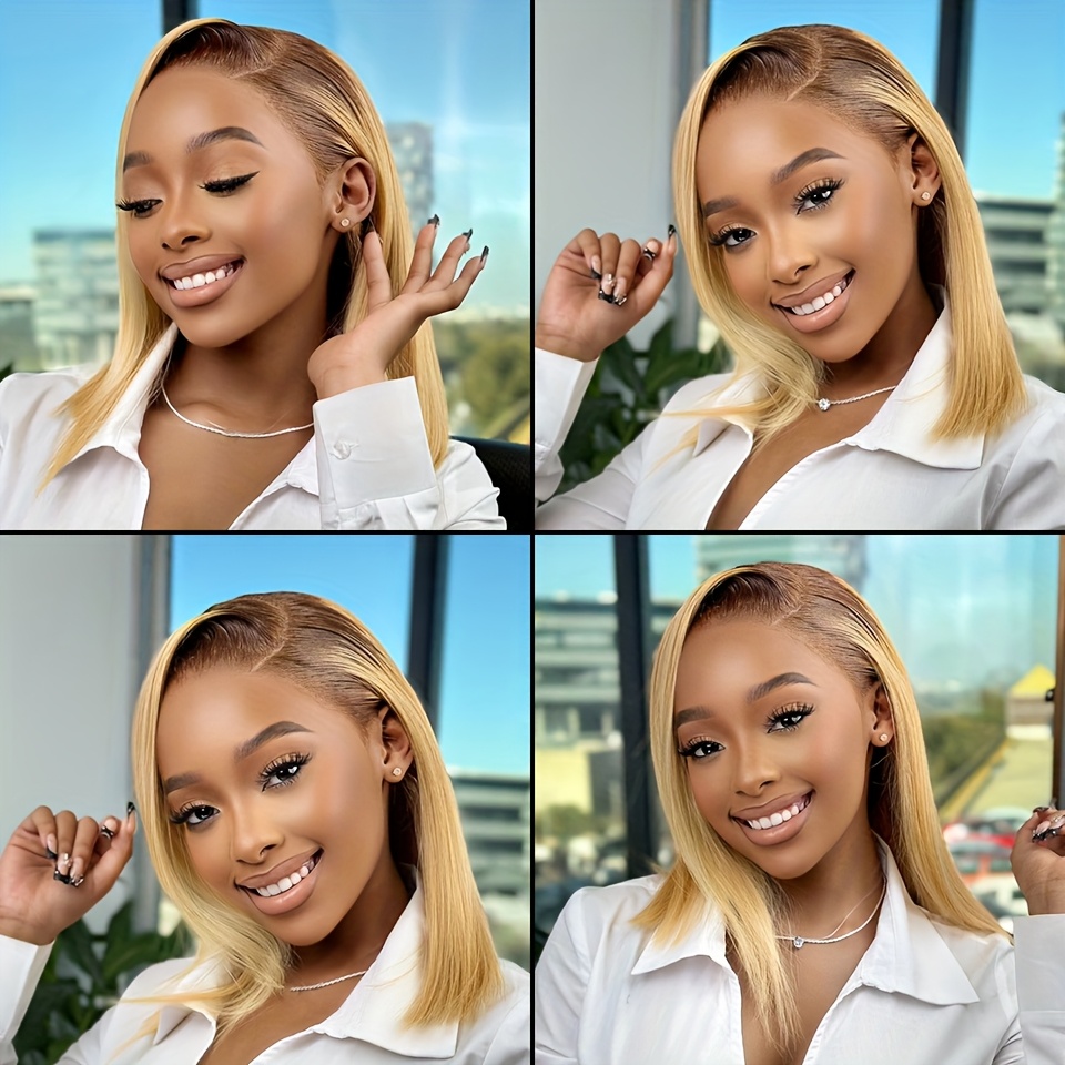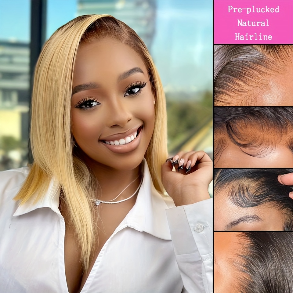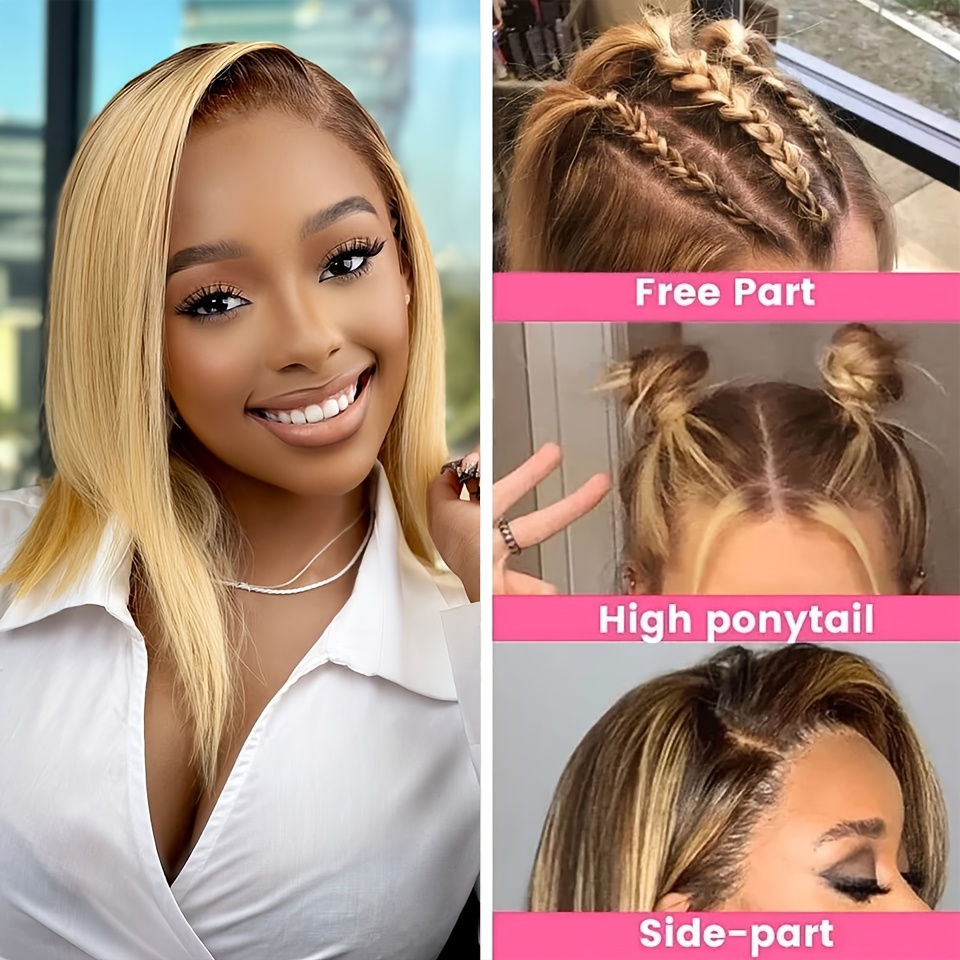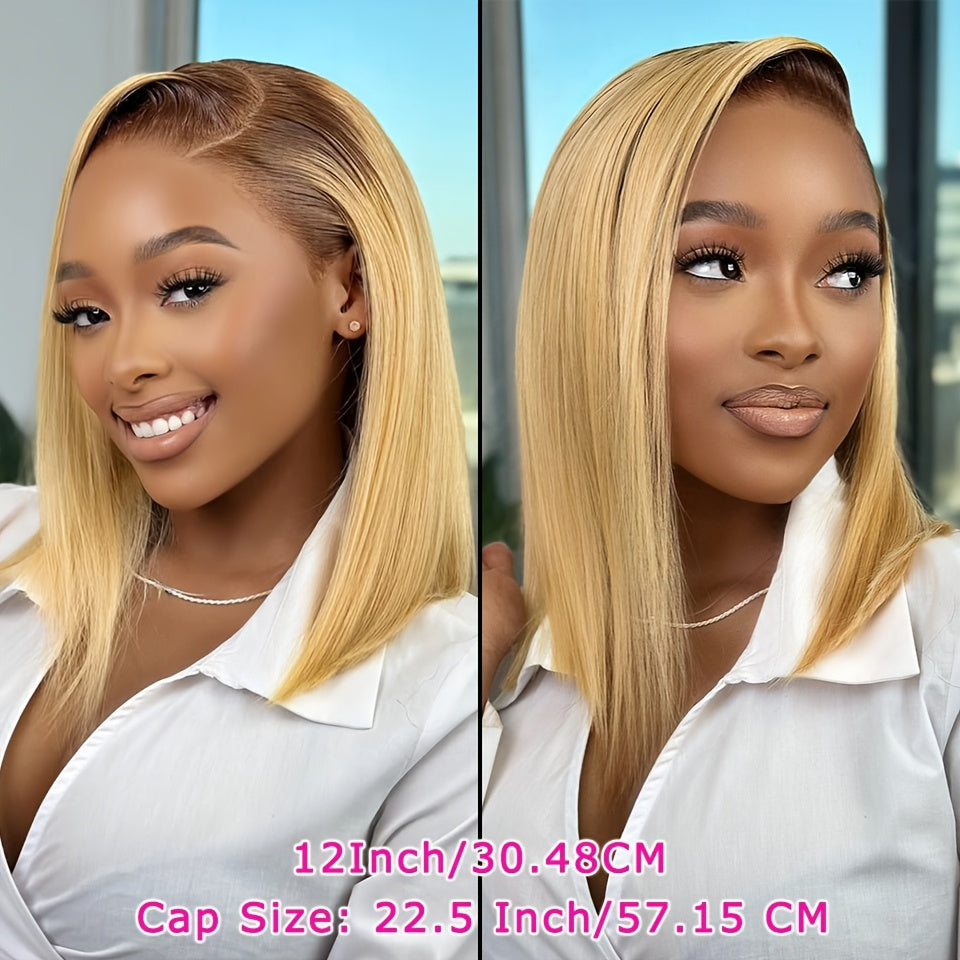 Human hair lace front wigs for women, featuring a straight bob style with 13x4 HD lace frontal. Pre-plucked with OT4/27 highlights, this honey blonde wig has a density of 150% and is perfect for Christmas and party occasions.