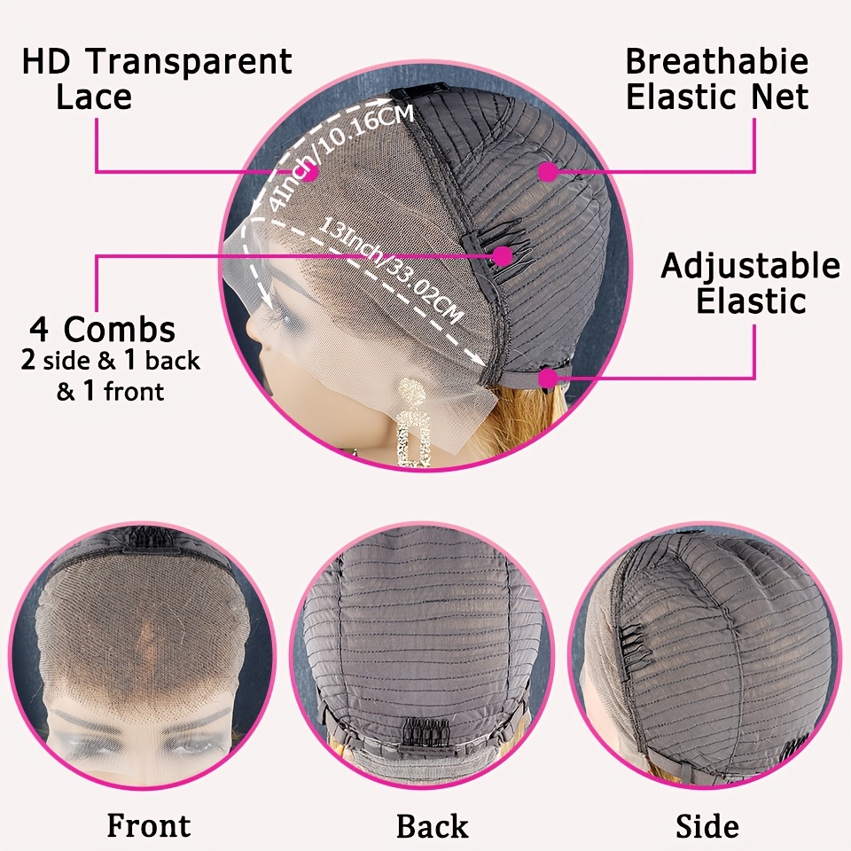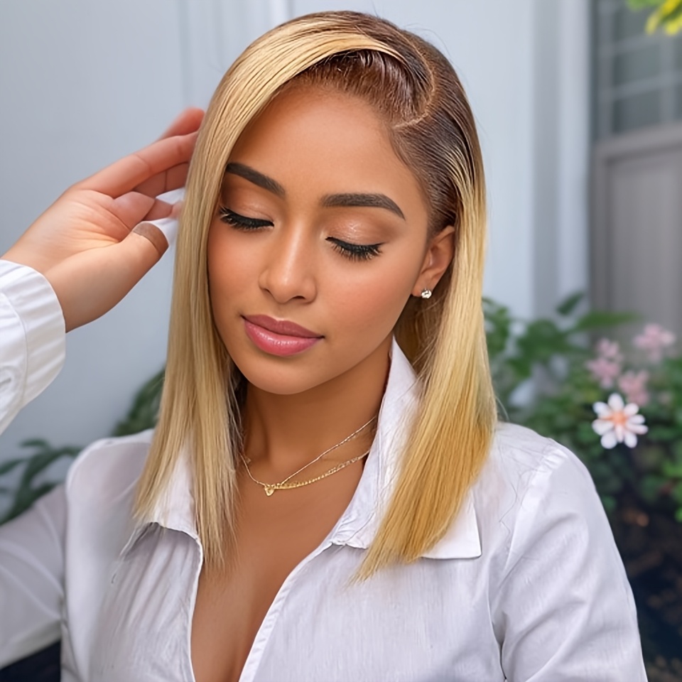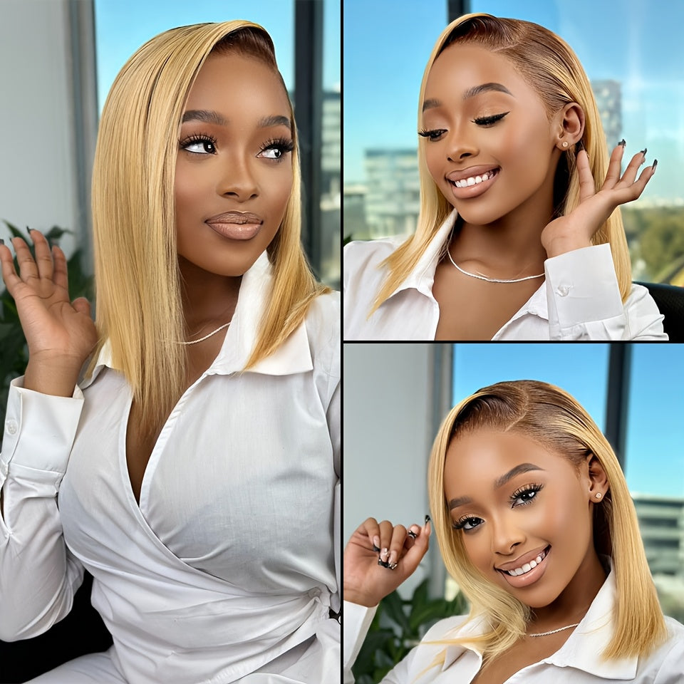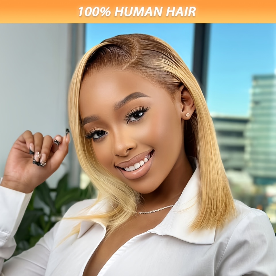 Human hair lace front wigs for women, featuring a straight bob style with 13x4 HD lace frontal. Pre-plucked with OT4/27 highlights, this honey blonde wig has a density of 150% and is perfect for Christmas and party occasions.